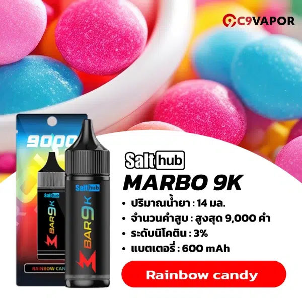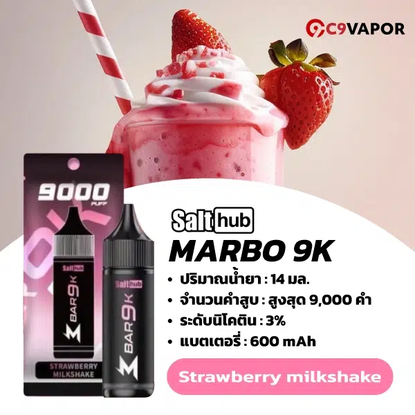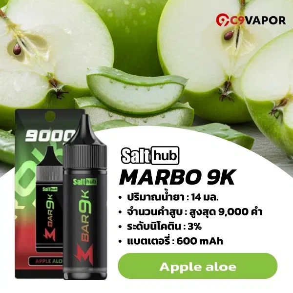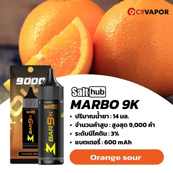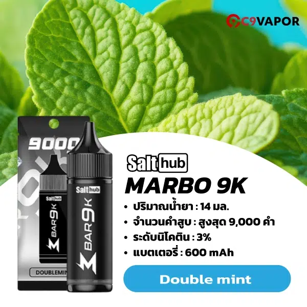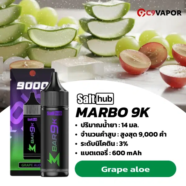Marbo Bar 9000 Puffs คือพอตใช้แล้วทิ้ง 9000 คำ ที่ครบเครื่องเรื่องคุณภาพและความสะดวกสบาย น้ำยาซอลนิค 30 mg ให้รสชาตินุ่มลึก หลากหลายกลิ่นที่ตอบโจทย์ทุกสไตล์ สเปคแบตเตอรี่และน้ำยาที่ให้มามากพอใช้งานยาวนาน ดีไซน์กะทัดรัด เหมาะกับพกพาใช้งานง่าย