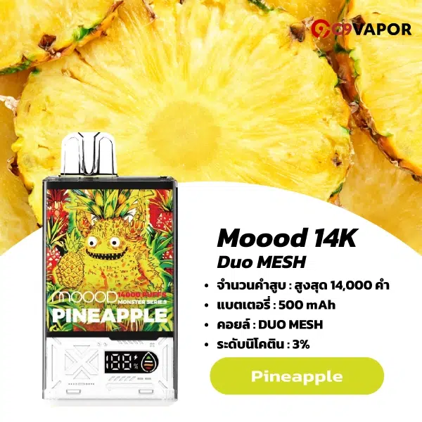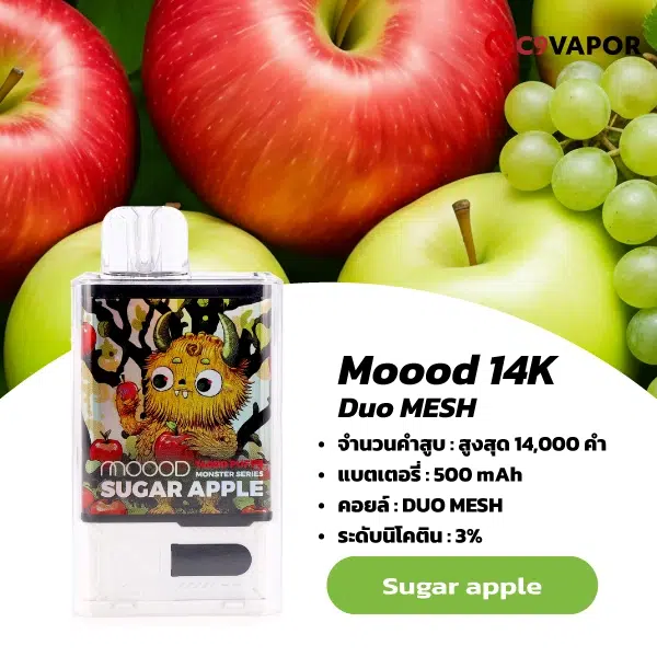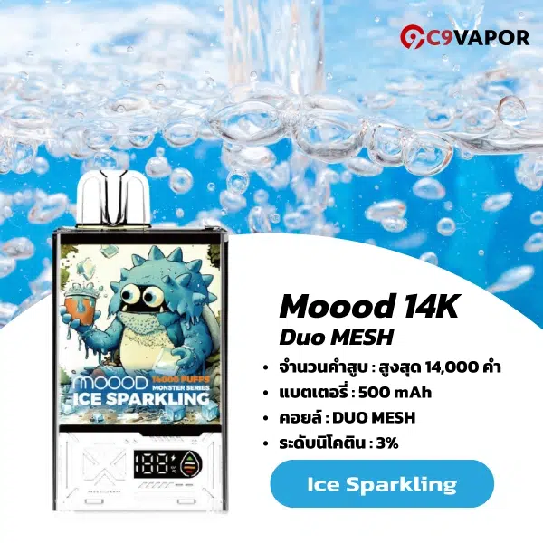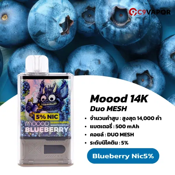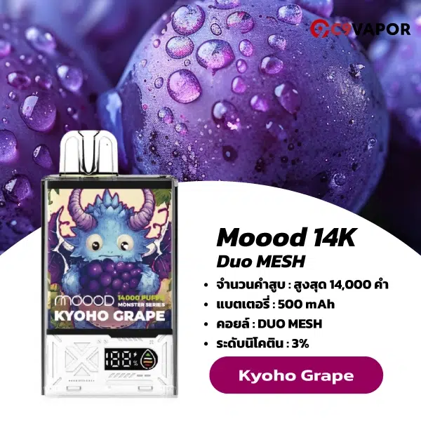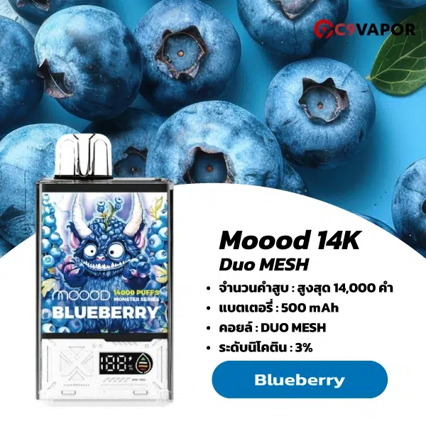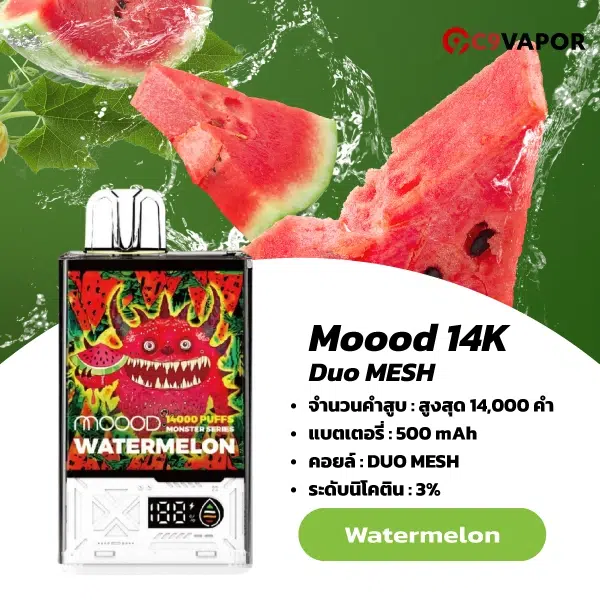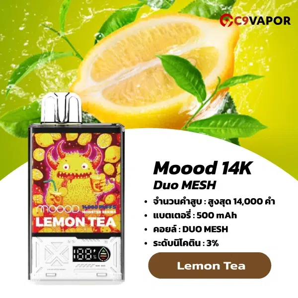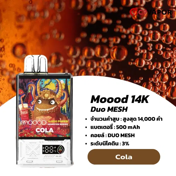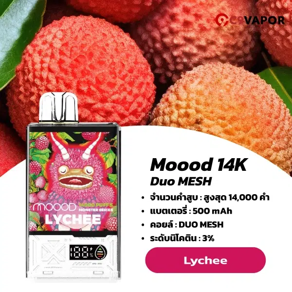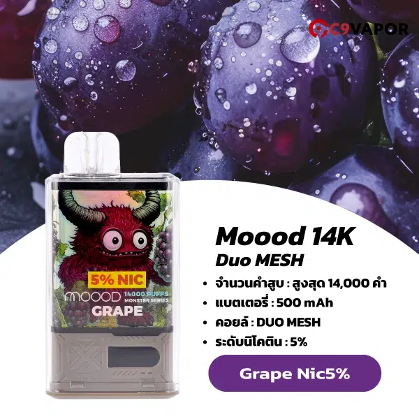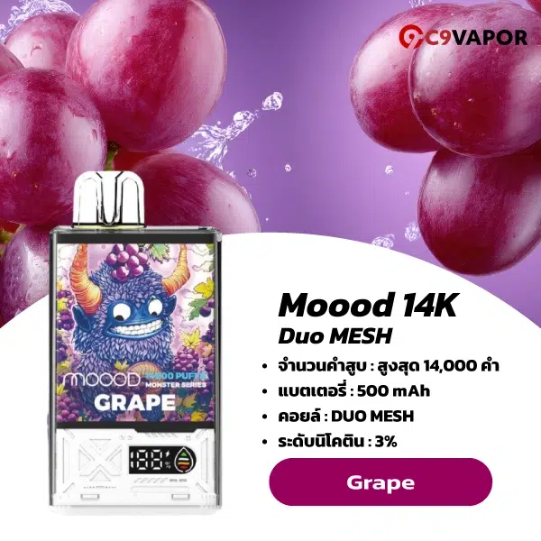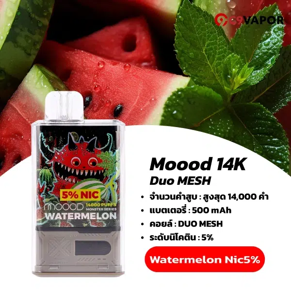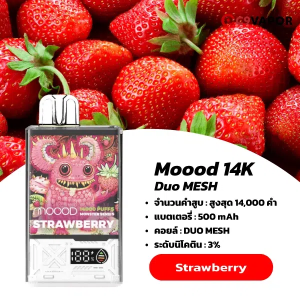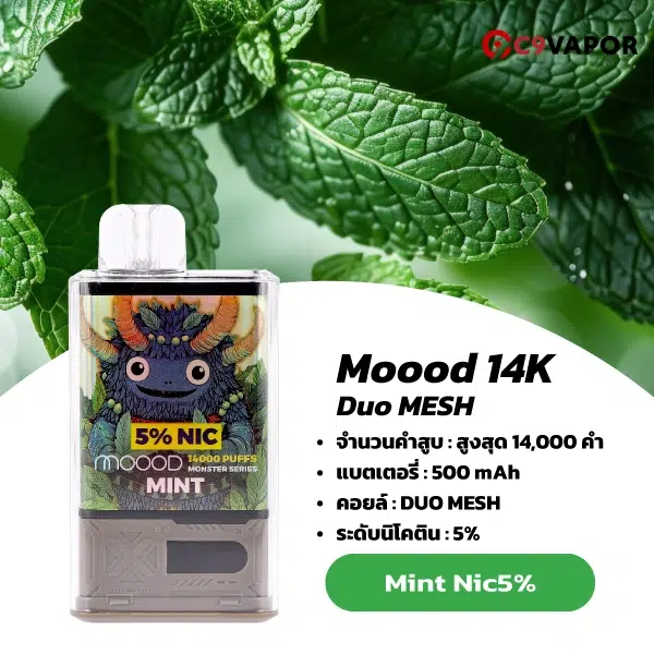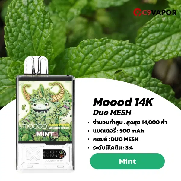 - DUO MESH Technology (Moood 14K Dou MESH): ด้วยระบบคอยล์ตาข่ายคู่ (DUO MESH) ที่เพิ่มพื้นที่ทำความร้อน ให้รสชาติเข้มข้นชัดเจน และได้กลิ่นที่ถูกต้องของน้ำยาตั้งแต่พัฟแรกจนถึงพัฟสุดท้าย